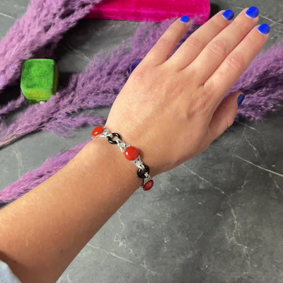 - Link bracelet features button cabochon coral alternating with donut ring onyx