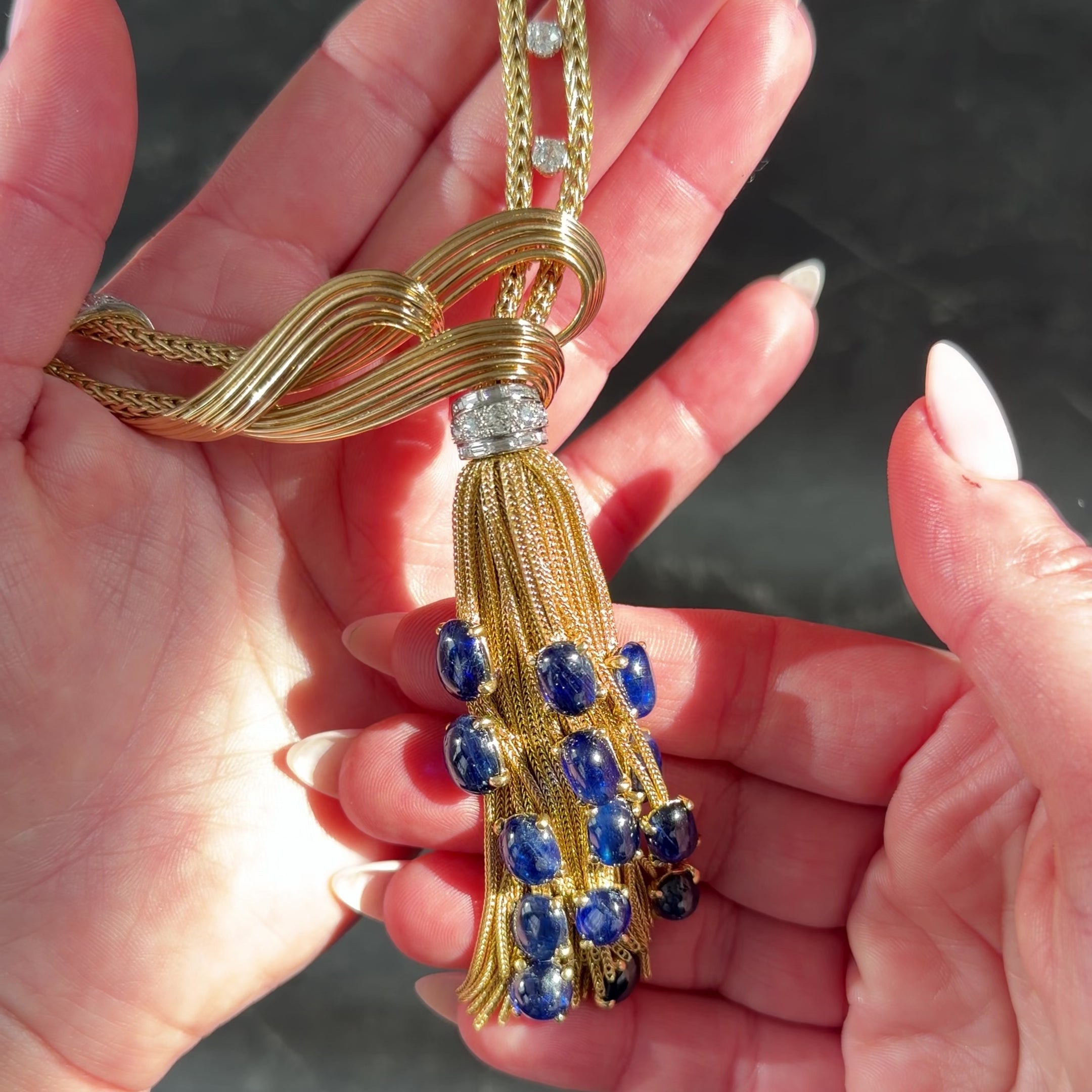 Boucheron Paris 1950's Sapphire Diamond 18 Karat Yellow Gold Platinum Vintage Tassel Necklace