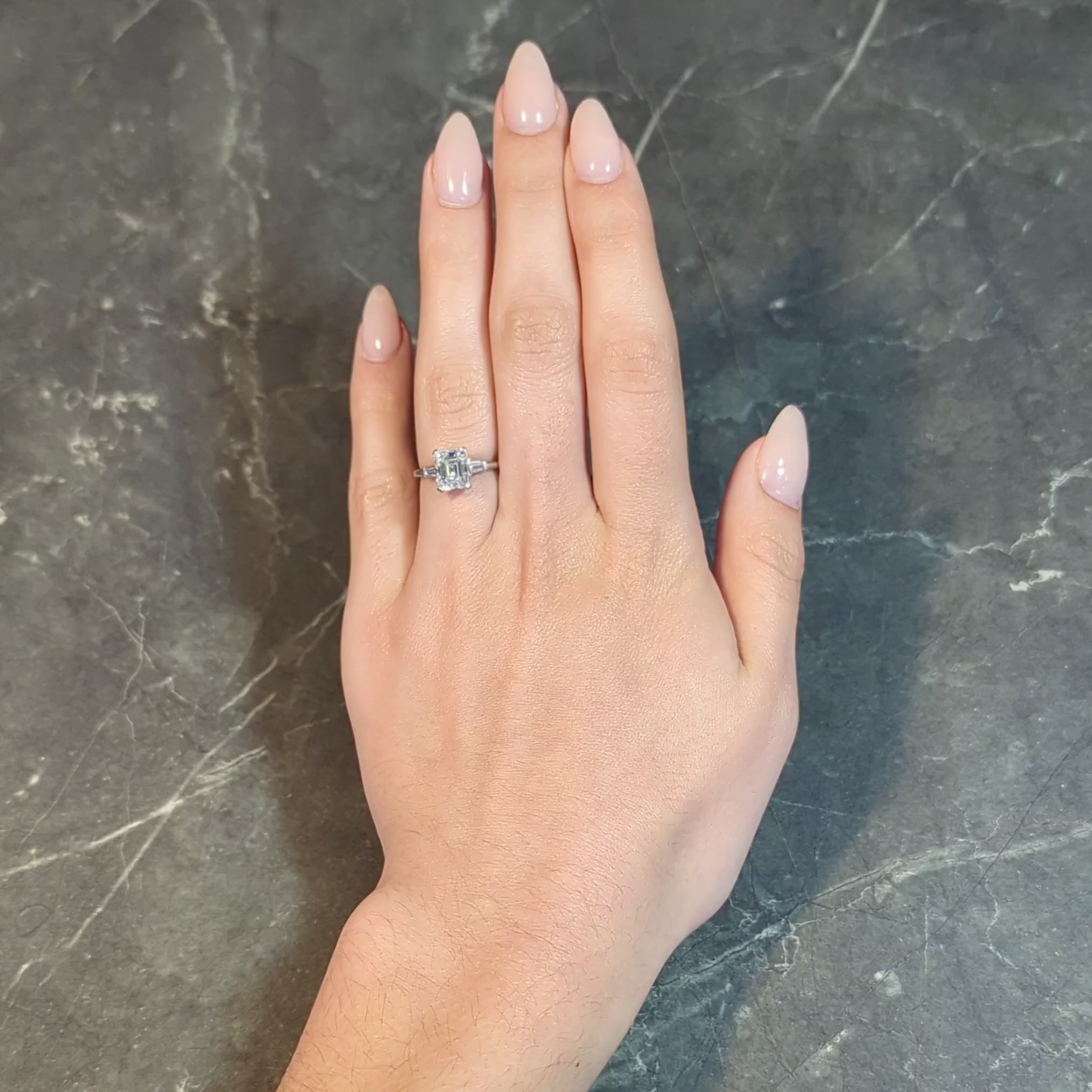 - Prong set in basket and flanked by tapered baguette cut diamonds