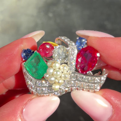 - Designed as a platinum woven basket with handle overflowing with various gemstones as fruit