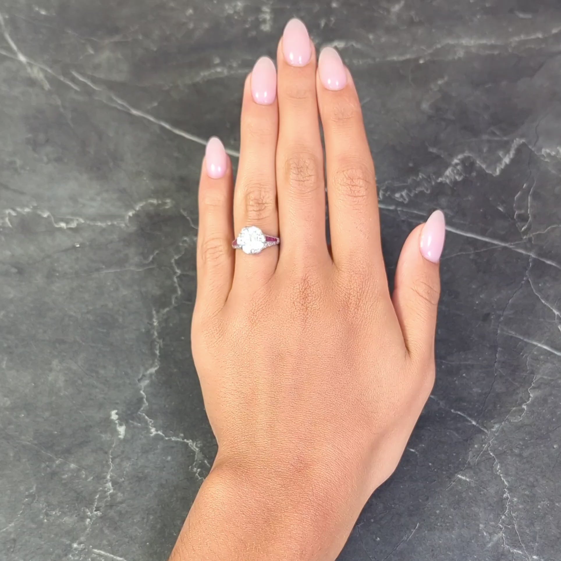 - Set with wide prongs and flanked by rows of calibré cut ruby shoulders and 'X' motif profile
