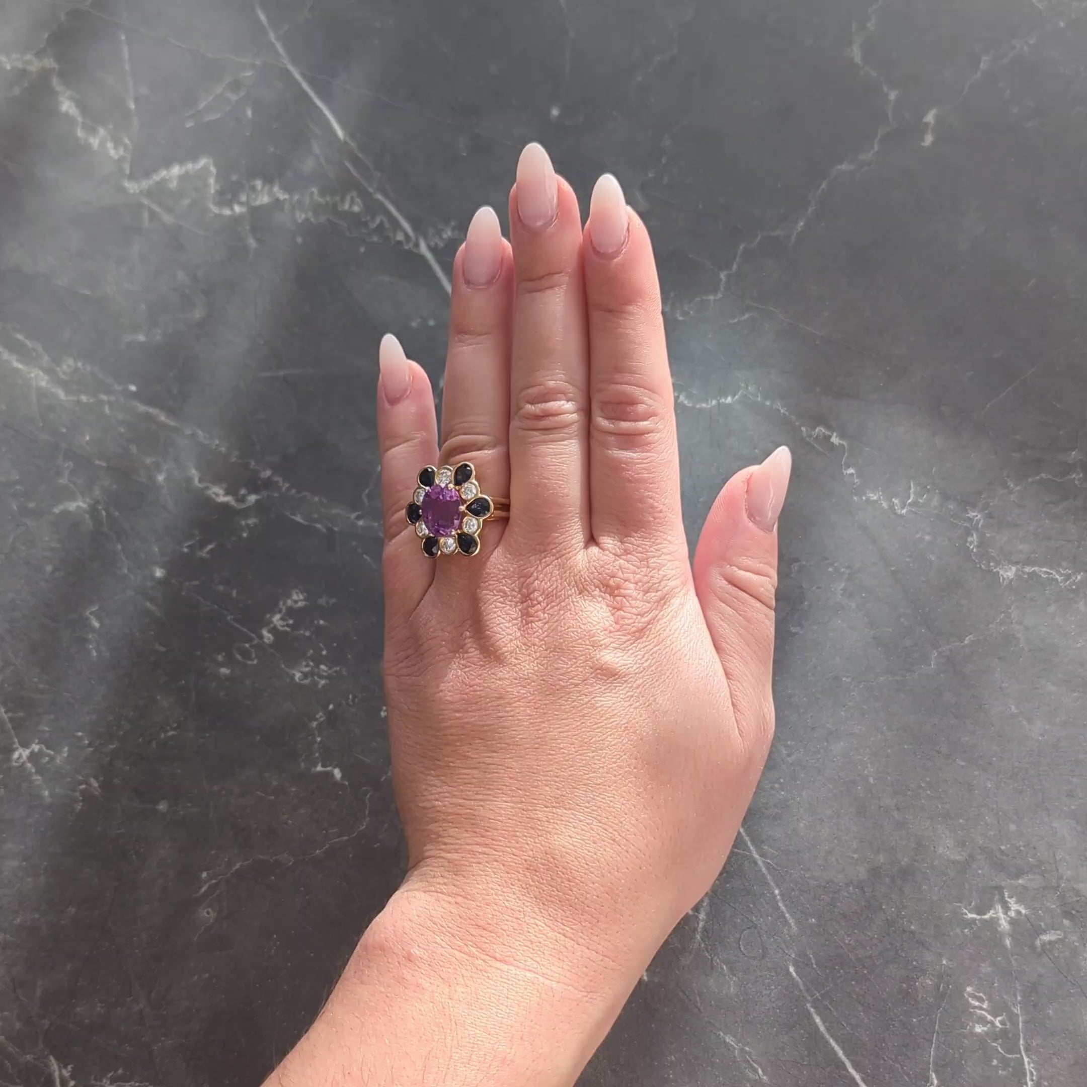 - Prong set with a clustered surround of alternating bezel set diamonds and sapphires
