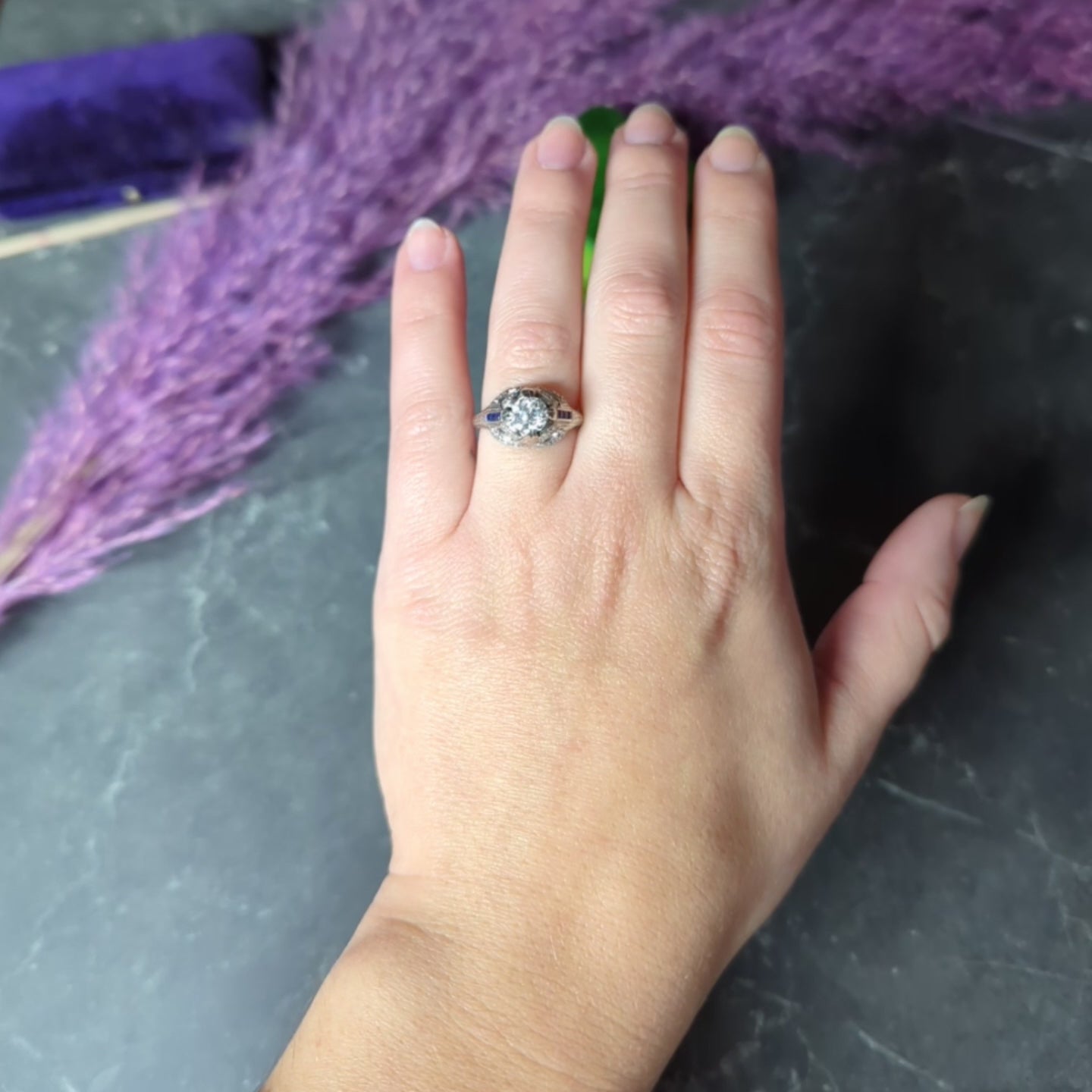 - Flanked by French cut sapphires channel set in shoulders