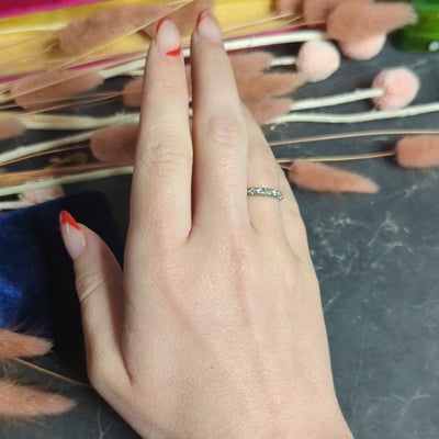 - Band ring features a row of front facing single cut diamonds