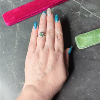 - Colorless body with spectral play-of-color; prong set
