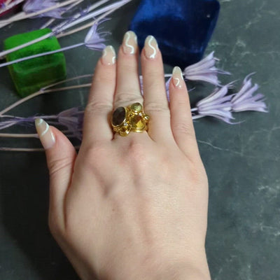 - Ring is designed as an asymmetrical cluster of bezel set gemstones