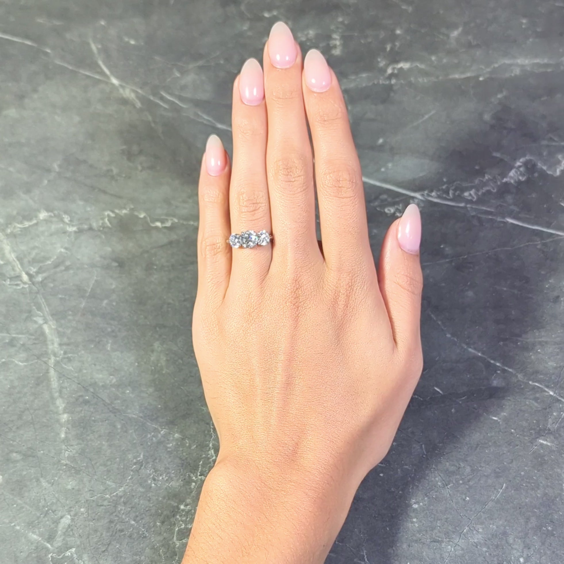 - Prong set with two additional round brilliant cut diamonds