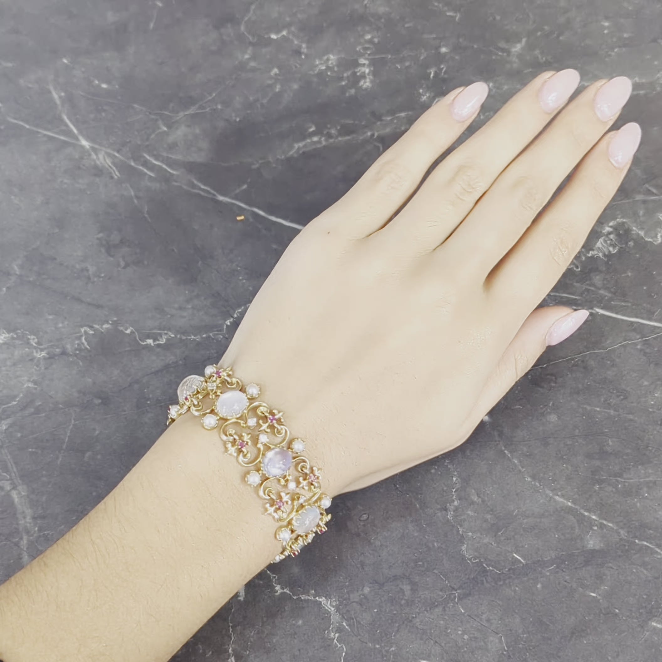 • Comprised of linked scroll motif stations featuring oval shaped moonstone cabochons measuring 8.0 x 10.0 mm