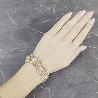 Victorian Diamond Ruby Moonstone Pearl 14 Karat Yellow Gold Fleur-De-Lis Antique Station Link Bracelet