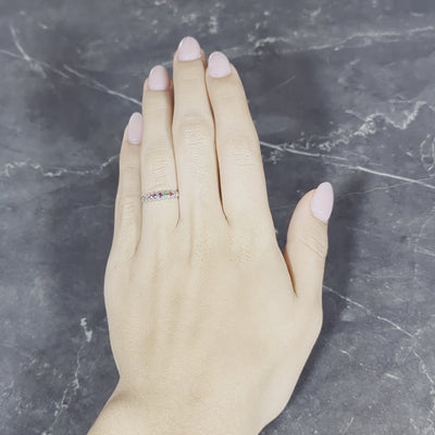 - Designed as an acrostic style ring with round cut ruby, emerald, garnet, amethyst ruby, and diamond