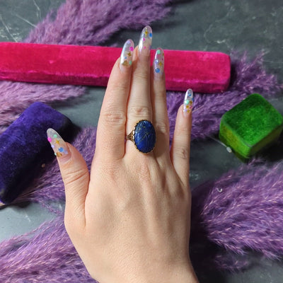 - Opaque ultramarine blue with pyrite flecking - set in a stylized scalloped bezel